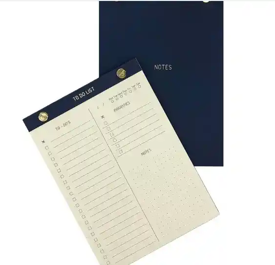 Sé productivo y organiza tu día con este Bloc de notas que incluye todo en uno. Sección de Lista de tareas, prioridades y notas. Especificaciones 80 hojas color marfil, 90 gms Hojas perforadas para fácil despliegue Tamaño 14 x 21 cm Detalle de portada y contraportada estampado al calor Encuadernación enblocado + tornillos dorados Papel certificado FSC
