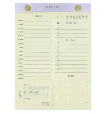 Sé productivo y organiza tu día con este Bloc de notas que incluye todo en uno. Sección de Lista de tareas, prioridades y notas. Especificaciones 80 hojas color marfil, 90 gms Hojas perforadas para fácil despliegue Tamaño 14 x 21 cm Detalle de portada y contraportada estampado al calor Encuadernación enblocado + tornillos dorados Papel certificado FSC