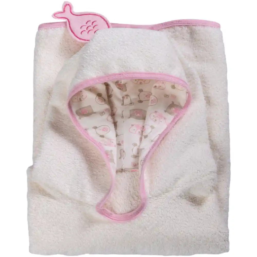 Medidas: 65 cm x 53 cm Composición: Toalla: 100 % algodón – Forro caperuza: 65 % poliéster – 35 % algodón Color: Beige / Rosado claro Para bebés de 0 a 24 meses