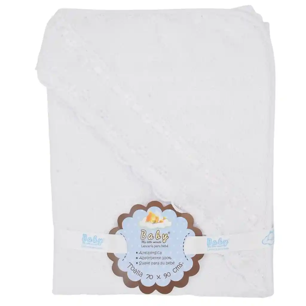 Toalla para bebé antialergica, absorbente 100%, suave para bebé. Las medidas son 70 cm x 90 cm. material: algodón 97%y 3%poliester. Color: Blanco con borde blanco y cinta blanco.