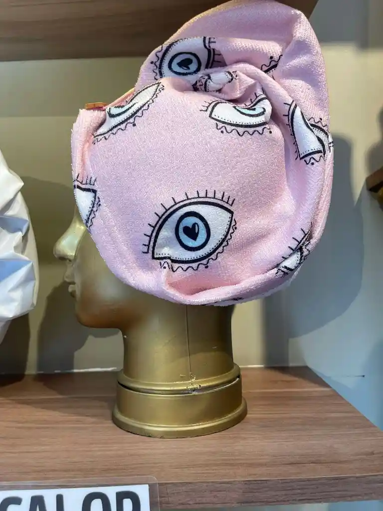 Toalla de microfibra estampado floral. Diseño y confección por nuestras marca Palm On eSTAMPADO DE OJOS CON FONDO ROSADO Toalla grande, con broche en botón y correa.