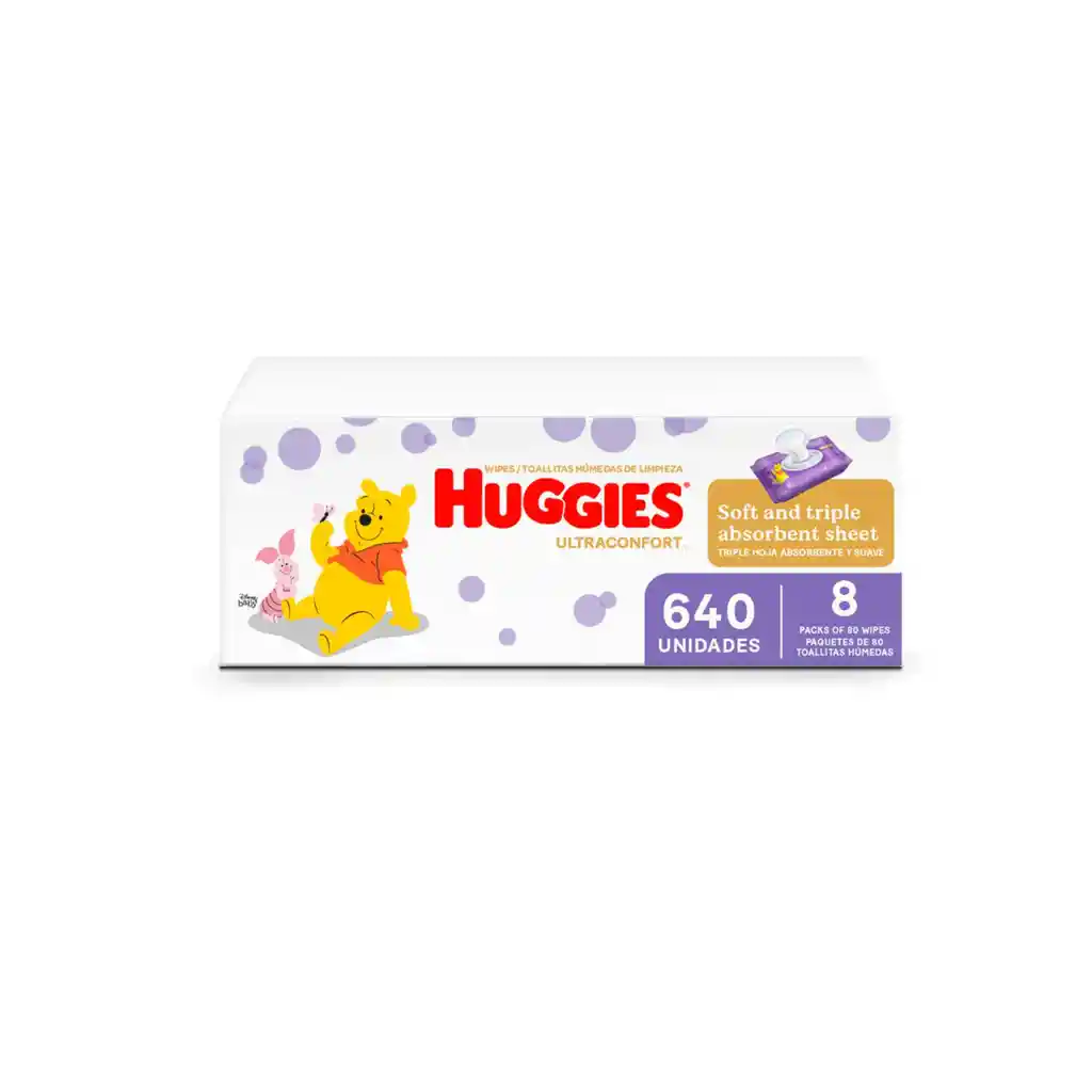 Las toallitas húmedas Huggies Ultraconfort brindan suavidad, hidratación y protección para la piel más delicada, brindándoles un cuidado especial en cada uso. Contienen extractos naturales con propiedades refrescantes y calmantes que ayudan a mantener la piel limpia y cómoda. Esta presentación incluye 640 unidades distribuidas en 8 prácticos paquetes de 80 toallitas cada uno, ideales para acompañarte en casa o de viaje y mantener a tu bebé siempre fresco, protegido y cómodo. Contiene 640 unidades de Toallitas Ultra-Confort para Bebé distribuidas en 8 paquetes de 80 unidades cada uno | Marca Huggies | Contiene extractos naturales para el cuidado de la piel de tu bebé | País de origen Colombia.