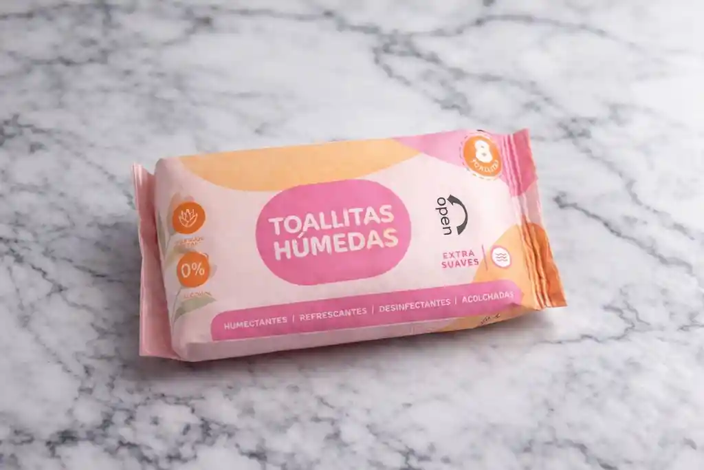 Paquete de toallitas húmedas en presentación compacta, con empaque plástico en tonos rosado, durazno y blanco. Indica que son extra suaves, con 0% alcohol, y con propiedades humectantes, refrescantes, desinfectantes y acolchadas. Tiene una tapa adhesiva tipo “open” para abrir y cerrar fácilmente. El producto contiene 8 toallitas y está colocado sobre un fondo de mármol claro que le da un estilo limpio y profesional.