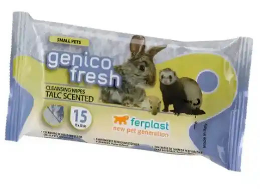 Somos Tienda Virtual de accesorios y mascotas MyL Pensando en nuestras Mascotas Hamster Conejos Cobayas Hurones disponemos de: Las toallitas Genico Fresh para roedores son útiles para limpiar a tu mascota. Gracias a su perfume con talco delicado, refrescante, que permite cuidar de sus mascotas: sólo pasarlos con precisión sobre los roedores pequeños y grandes para mantenerlo siempre cuidados, limpios y perfumados. Genico pertenece a la gama de productos para el cuidado y la higiene de los roedores, tienen una acción desodorante eficaz ya que constan de una solución perfumada sin alcohol, no son irritantes, pero particularmente delicadas y suaves. Envase que contiene 15 piezas.