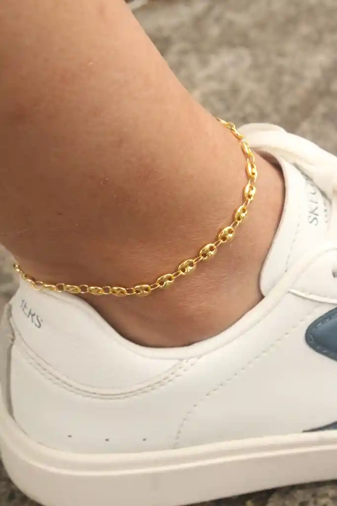 Tobillera dorada en rodio, con diseño de guccis gruesas, moderna y llamativa, ideal para un look elegante y en tendencia. ✨