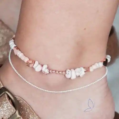 Tobillera hecha a mano con piedra picada y dijes oro rosa.