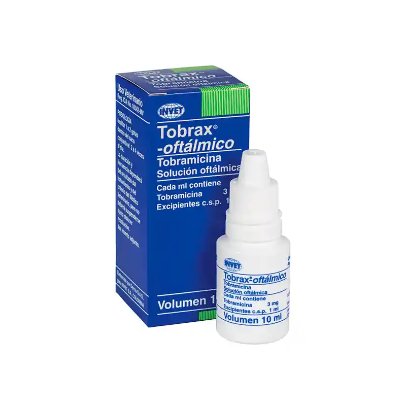 COMPOSICIÓN: Cada ml de solución oftálmica contiene Tobramicina 3 mg, INDICACIONES: Tobrax-oftálmico es una solución de uso oftalmológica, útil en el tratamiento de infecciones oculares externas tales como conjuntivitis, queratoconjuntivitis, úlceras corneales, enfermedades oculares producidas por virus y hongos, además de actuar como profiláctico en procesos post-quirúrgicos tanto en perros como en gatos. Es altamente efectivo contra microorganismos resistentes a la Gentamicina, incluyendo Pseudomona aeruginosa.
