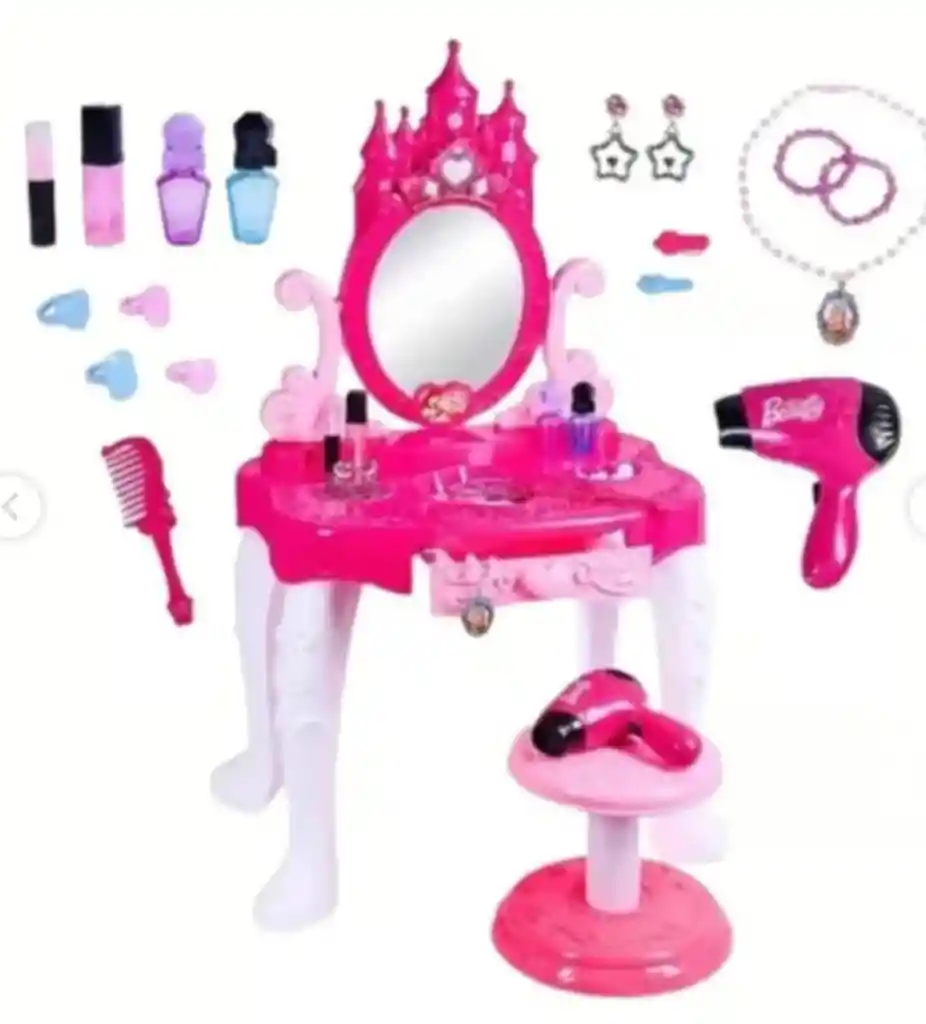 Detalles Tocador Princess Crown con varios accesorios, sonido y luz. Para las chicas amantes de las princesas y de este universo lleno de magia, el tocador Princess Crown es una excelente opción. Con este juguete, las niñas pueden dar rienda suelta a su imaginación y hacerse pasar por personajes diferentes. Viene con un tocador para niños y accesorios exclusivos, como una minisecadora y un cepillo, que permiten a las más pequeñas vestirse frente al espejo y verse aún más hermosas. Con sonido y luz en la parte superior del tocador, el juego es aún más encantador. El espejo refleja fielmente y está hecho de un material seguro para niños. La secadora también emite sonidos para que la experiencia sea más realista. Tipo de batería de la secadora: AA. Contenido del paquete: 1 – Base de plástico montable con espejo de plástico 1 – taburete de plástico montable 2 – pulseras 1 – Par de pendientes 2 – Botellas de diferentes colores 1 – Lápiz labial 1 – Peine 2 – Anillos de diferentes modelos 1 – Secador de juguetes 2 – Pinzas para el pelo Medidas del juguete: Altura: 77 cm Ancho: 30 cm Longitud: 45 cm Medidas del paquete: Altura: 65 cm #DNT_FBABHLBJKBBNKFPIBAOPBDNFBohceamo Ancho: 10 cm Longitud: 45 cm