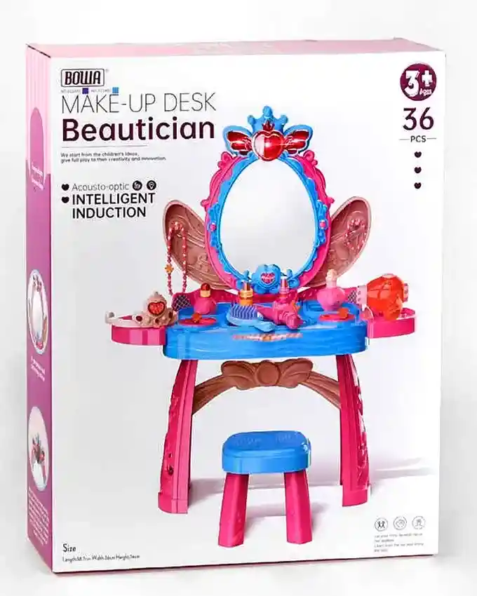 TOCADOR PARA NIÑAS CON ACCESORIOS Tocador de lujo con silla Perfecto para desarrollar la imaginación de una niña y mejorar el aprendizaje ! Mejora las habilidades sociales y cognitivas de un niño Tamaño del producto despues del montaje (cm) 57x29x70.5 tamaño del embalaje (cm) 45.5 x 10.3 x 59 Edad recomendada + 3 Años