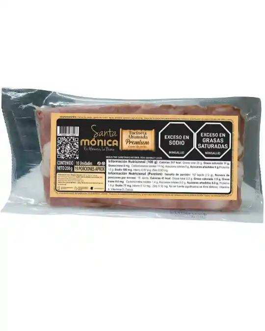 Tocineta Ahumada Premium Santa Mónica x10 unidades (250 g). Elaborada con cortes seleccionados de cerdo, sabor ahumado natural y textura crocante al cocinar. Empaque al vacío que preserva su frescura. Ideal para desayunos, recetas gourmet o asados.