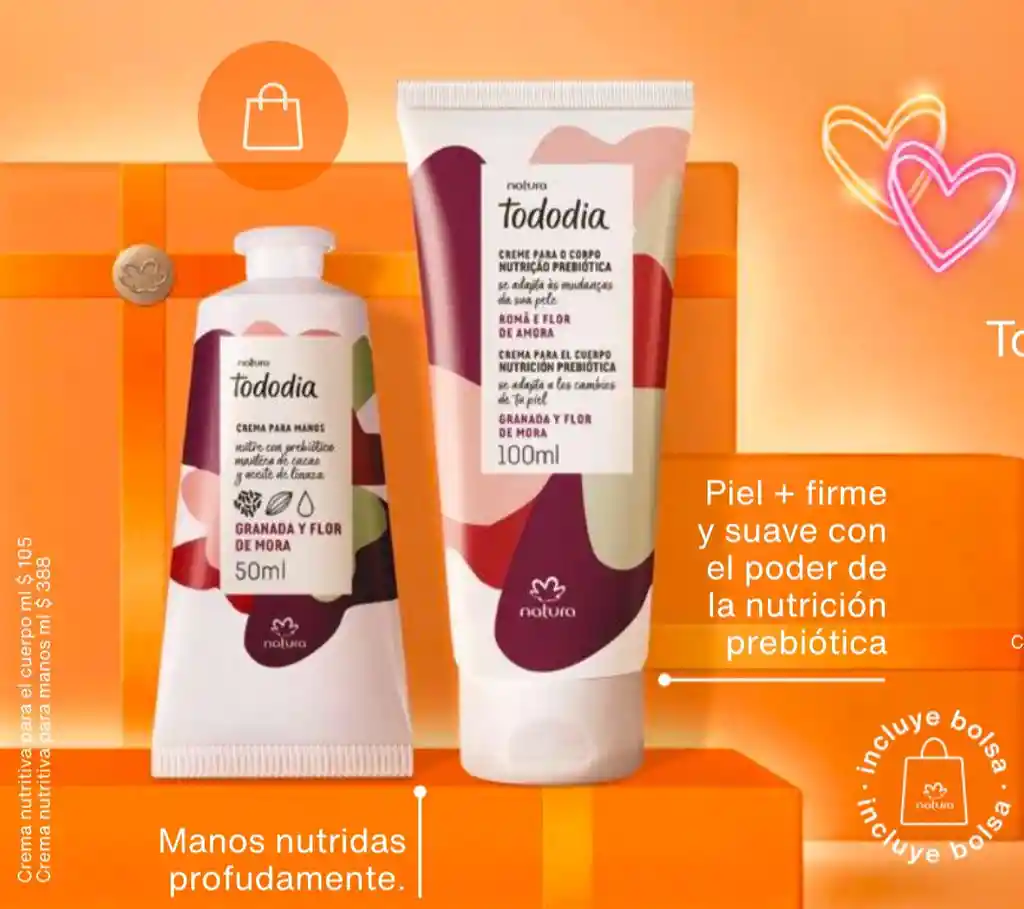 1 crema corporal nutrición prebiótica Granada y flor de mora. 1 crema para manos con manteca de cacao y aceite de linaza