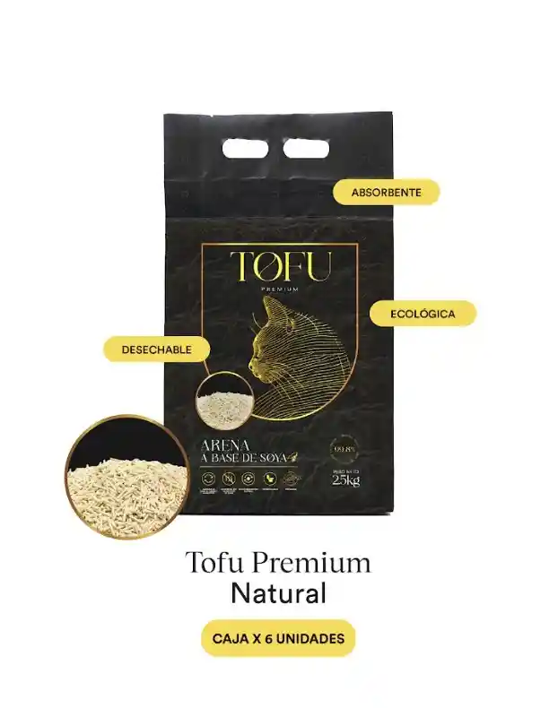 Arena de TOFU para gatos, hámsters y conejos 100% natural. Elaborada a base de soya, goma gúar y almidón de maíz. 99.8% libre de polvo y máxima aglomeración. Biodegradable y soluble en agua.