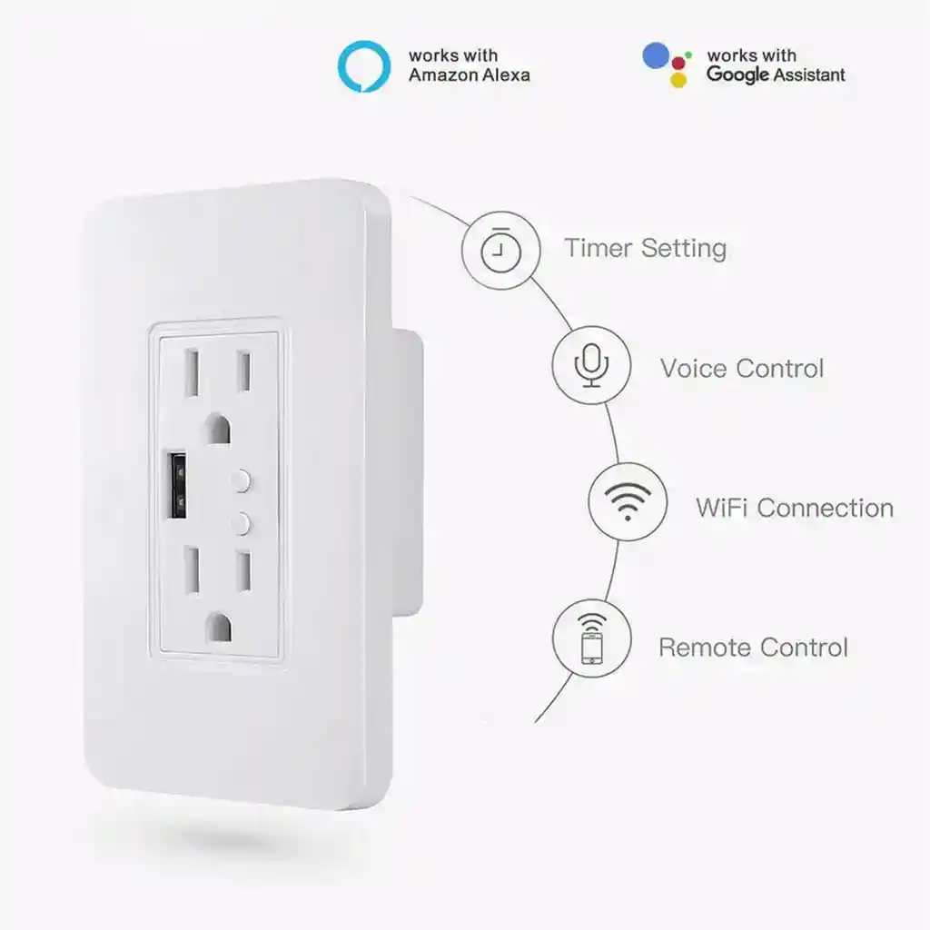 Enchufe Tomacorriente de pared inteligente con Wifi, toma de corriente doble con puerto de carga USB, Control remoto por aplicación Smart Life, funciona con Alexa y Google Home Incorpora 2 salidas con polo a tierra controladas independientemente; Puerto USB de 2.1A para cargar dispositivos móviles; Automatice y controle el suministro de energía de forma remota a través de su dispositivo móvil; Puede controlar los dispositivos conectados al tomacorriente desde cualquier lugar a través del teléfono inteligente Android / iOS. Puede usarlo junto con la aplicación Smart Life como control remoto, o también puede encender o apagar cada canal del tomacorriente de forma independiente, ya que cuenta con un botón para cada canal. Temporizador: configure los tomacorrientes para el encendido y apagado de sus equipos a determinada horas Comparta el control de sus tomacorrientes de su hogar inteligente junto con su familia Compatible con Google Home y Alexa -Tamaño: 120*71*50mm -Corriente Máxima: 15A -USB carga inteligente: 5V / 2.1 A -Compatible solo con redes Wifi 2.4 Ghz -App: Smart life 9. Compatible con