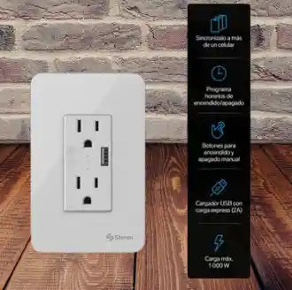 Características destacadas Control inteligente de equipos electrónicos o eléctricos. Encendido, apagado o programación, con tu celular, donde quiera que estés Se vincula por Wi-Fi a tu módem Puedes sincronizarlo a más de un celular Control independiente para cada contacto Control independiente para el cargador USB La salida USB es de carga express (2 A) Compatible con Android y iPhone Compatible con Google Assistant y Alexa Función temporizador (timer) Botones para encendido o apagado manual Contactos aterrizados y polarizados Carga máxima: 1 000 W