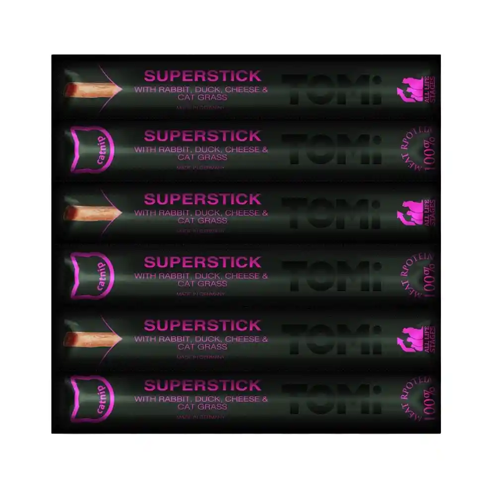 TOMi Sticks for Cats – Rabbit, Duck, Cheese & Cat Grass contienen aproximadamente un 95 % de carne real, con 6 % de carne de conejo, 6 % de pato, un ~2 % de queso y ~0,1 % de hierba gatera (cat grass o catnip)