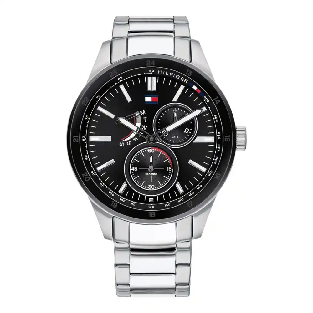 Reloj Tommy Hilfiger Genero:Hombre,Material:Acero Inoxidable,Modelo:Austin,Color pulso:Plateado,Material Pulso:Acero Inoxidable,Colección:Austin,Tono de caja:Plateado,Material de caja:Acero Inoxidable,Color tablero:Negro,Material cristal:Mineral,Ancho de banda:21 mm,Largo:220mm,Resistencia al agua:50 mts mts mts,Size caja:44 mm,Tipo de reloj:Análogo,Forma:Circular,Tipo de movimiento:Cuarzo