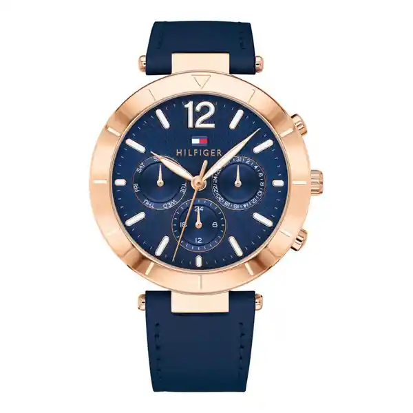 Reloj Tommy Hilfiger Genero:Mujer,Material:Cuero,Modelo:1781881,Color pulso:Azul,Material Pulso:Cuero,Colección:-,Tono de caja:Rosa,Material de caja:Acero Inoxidable,Color tablero:Azul,Material cristal:Mineral,Ancho de banda:19 mm,Largo:150 - 190 mm,Resistencia al agua:30 mts,Size caja:38 mm,Tipo de reloj:Analogo,Forma:Circular,Tipo de movimiento:Cuarzo