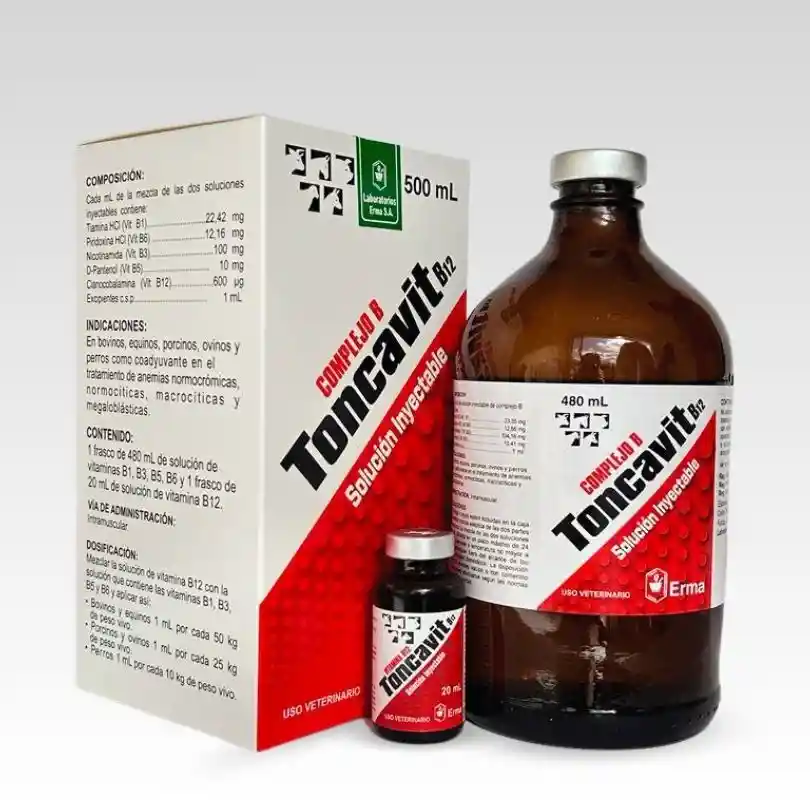 Descripción Composición: Cada mL de la mezcla de las soluciones inyectables contiene: Tiamina HCl (Vit B1) 22,42 mg Piridoxina HCl (Vit B6) 12,16 mg Nicotinamida (Vit B3) 100 mg D-Pantenol ( Vit B5) 10 mg Cianocobalamina (Vit B12) 600 mcg Excipientes c.s.p. 1 mL Contenido: 1 frasco x 480 mL de solución de vitaminas B1, B6, B3 y B5 y 1 frasco de 20 mL de solución de vitamina B12 Indicación: Tratamiento para los siguientes tipos de anemias agudas y crónicas: Normocrómicas Normocíticas Macrocíticas Megaloblásticas. Coadyuvante en el tratamiento de los problemas generados por enfermedades infecciosas y parasitarias, siempre y cuando se realice la terapia antibiótica o antiparasitaria correspondiente. Estimulante del apetito. En anorexia (falta de apetito debida a las deficiencias de las vitaminas presentes en la fórmula.) Dosis y vía de Administración: Intramuscular. Dosis: Una vez mezcladas las dos soluciones aplicar por vía intramuscular: Bovinos y equinos 1 mL por cada 50 Kg Porcinos ovinos y caprinos 1 mL por cada 25 Kg Caninos 1 mL por cada 10 kg Aplicar diariamente durante 5 días seguidos. La dosis y duración del tratamiento pueden aumentar según el criterio del Médico Veterinario. La mezcla de las dos soluciones debe utilizarse dentro de las siguientes 24 horas a la preparación.