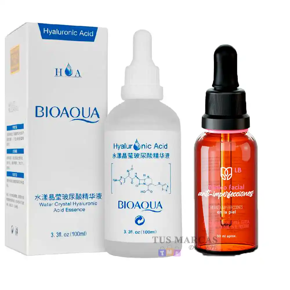Combo de cuidado facial tónico anti imperfecciones LB + ácido Hialuronico Bioaqua de 100 ml. también conocido como Tónico despigmentante Lb anteriormente llamado ayuda a elminar manchas y brinda un tono uniforme en la piel. Acido hialuronico Bioaqua 100 ml tónico despigmentante Lb 40 ml