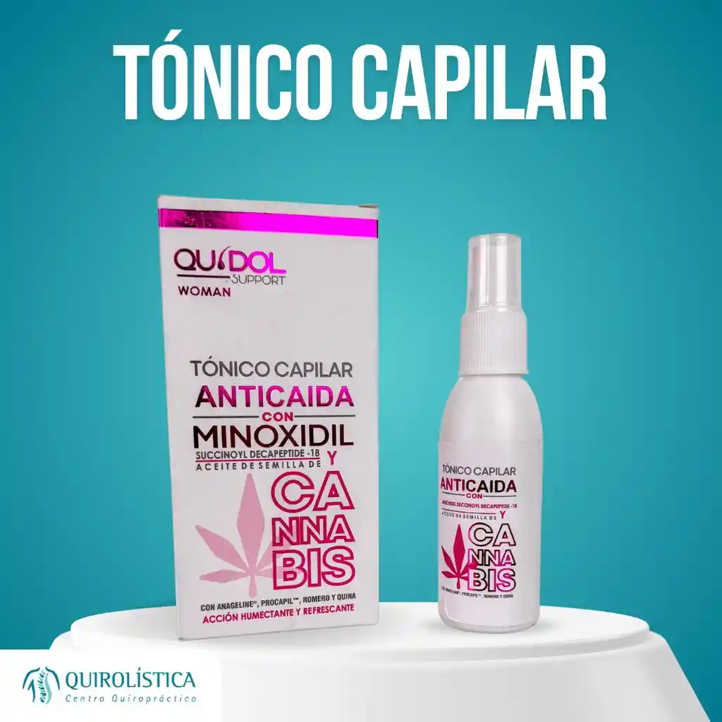 "💜 Fortalece y revitaliza tu cabello desde la raíz El Tónico Capilar Anticaída con Minoxidil y Cannabis de Quidol Woman está especialmente diseñado para combatir la caída y el quiebre del cabello, aportando nutrientes esenciales que fortalecen la fibra capilar. Su fórmula innovadora con Minoxidil, aceite de semilla de Cannabis y péptidos activos ayuda a mejorar la salud del cuero cabelludo, reduciendo la fragilidad y promoviendo un cabello más fuerte, denso y resistente. ✨ Beneficios principales Previene la caída y quiebre del cabello. Estimula el crecimiento capilar gracias al Minoxidil. Nutre y revitaliza con Cannabis sativa seed oil, argán y romero. Mejora la densidad y resistencia del cabello. Aporta hidratación, frescura y vitalidad al cuero cabelludo. 🌿 Ingredientes destacados Minoxidil: estimula el crecimiento capilar. Cannabis Sativa Seed Oil: nutre y protege el cuero cabelludo. Succinoyl Decapeptide-18: péptido regenerador. Aceite de Argán, Romero y Quina: fortalecen y revitalizan la fibra capilar. Proteína de Lúpulo e ingredientes humectantes para suavidad y brillo. 📌 Modo de uso Con el cabello seco, aplicar por las noches entre 6 y 10 atomizaciones directamente en el cuero cabelludo. Asegúrate de cubrir bien las zonas con mayor tendencia a la caída. Activar el producto presionando con la yema de los dedos durante 30 segundos (sin masajear). Agitar antes de usar. ⚠️ Precauciones No usar en caso de hipersensibilidad a los componentes. Mantener fuera del alcance de los niños. No utilizar durante la lactancia ni en presencia de niños lactantes. Conservar en un lugar fresco, a temperatura no mayor de 30°C. 💜 Recupera la fuerza y belleza de tu cabello Si buscas un tratamiento eficaz y confiable contra la caída, el Tónico Capilar Anticaída con Minoxidil y Cannabis Quidol Woman es tu aliado ideal. ¡Atrévete a probarlo y luce un cabello fuerte, sano y lleno de vida!"