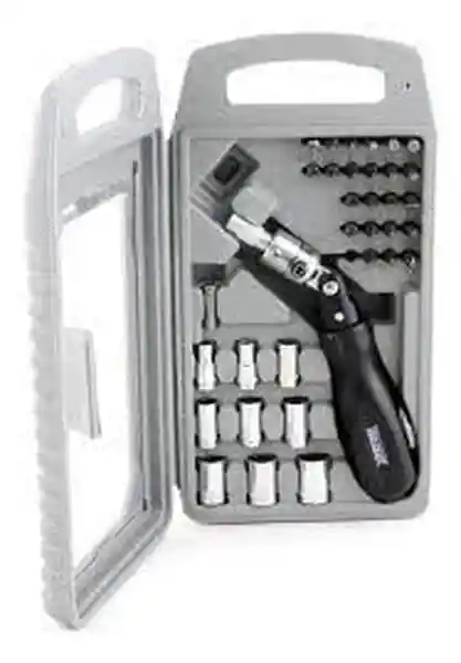 Contiene 32 Unidades. Juego de Destornillador Tipo Ratchet y Puntas Copas Fabricados en Acero al Carbón- su Sistema de ''Trancador de Leva'' Elimina Los Tornillos Dañados Puntas Fabricadas en Cr-V Incluye: 1 Adaptador Para 9 Copas- 1 Maneral Con Ratchet- 1 Estuche