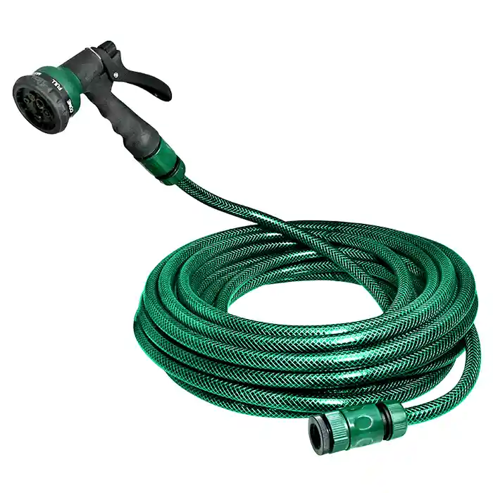 Manguera tipo Swan con acoples y pistola graduable 5 posiciones 1/2 x 15 mts. Aplicaciones: lavado del auto, jardinería, hogares, hoteles, restaurantes, entornos.