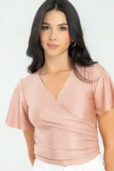 En Tejido de Punto Satinado Escote Cruzado Con Prenses Decorativos en Costado Manga Corta Campana.