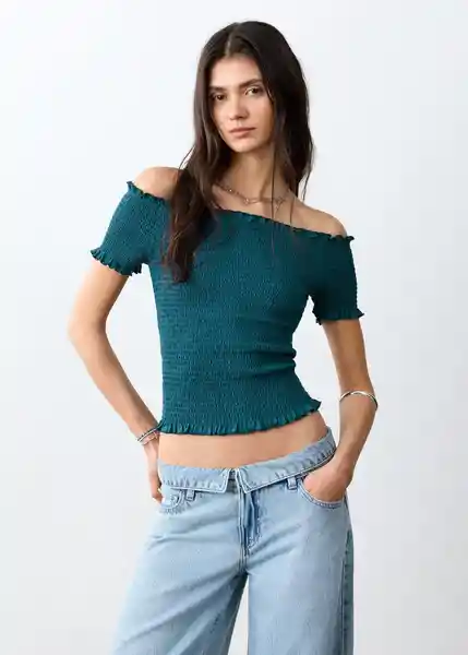 Cuello Barco Detalle de Volantes Diseño Crop Diseño Entallado Escote Cuadrado Manga Corta Tejido 100% Algodón Tejido Fruncido - 27055160_59.
