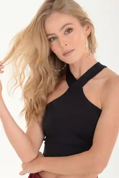 En Tejido de Punto Penelope Fondo Entero Cuello Halter Espalda Cruzada Fajón en Cintura.