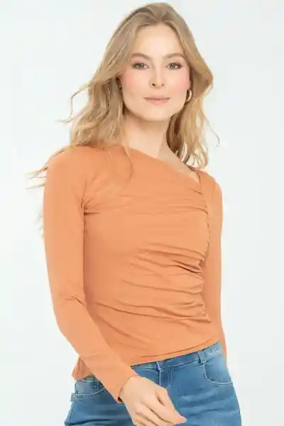 En Tejido de Punto Fondo Entero Escote Asimétrico en Frente Con Falso Corte Con Recogido en Costado Frente Manga Larga Ruedo Asimétrico. Silueta Ajustada.