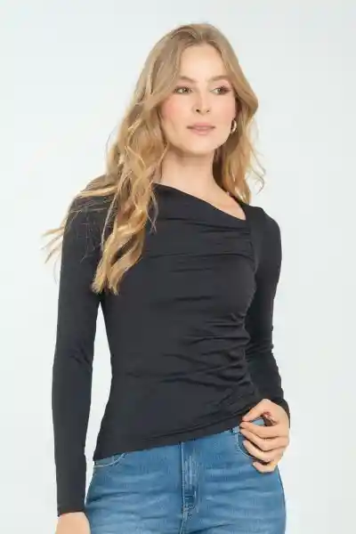 En Tejido de Punto Fondo Entero Escote Asimétrico en Frente Con Falso Corte Con Recogido en Costado Frente Manga Larga Ruedo Asimétrico. Silueta Ajustada.