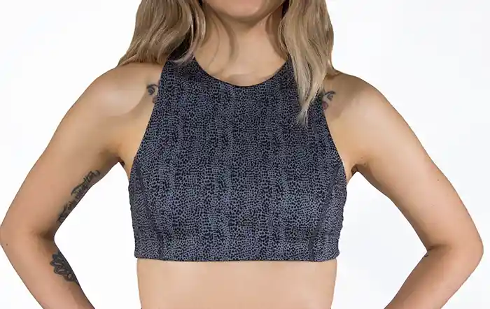 Top cuello halter en Kolor Plus (75% poliéster- 25% spandex), forrado para brindar mejor cobertura, este elegante top cuenta con un tejido transpirable de alto rendimiento que se seca rápidamente y ofrece mucha elasticidad para entrenamientos de bajo impacto.
