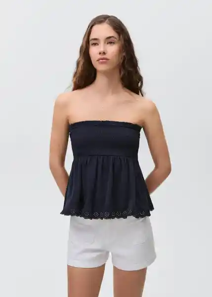 100% Algodón Detalle de Volante en la Cintura Diseño Corto Palabra de Honor Panel Fruncido Tejido Con Bordado Inglés - 87016340_56.