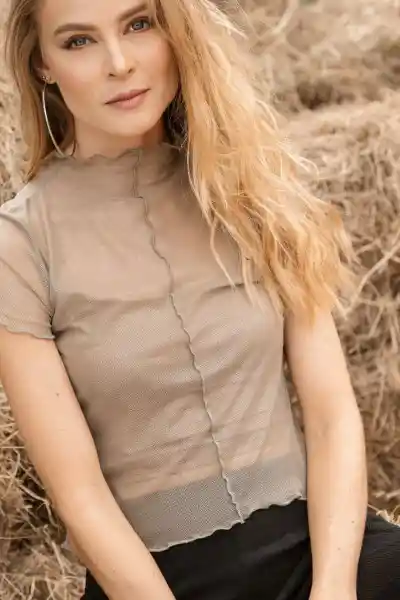 Blusa en Mesh Fondo Entero Con Brillo Cuello Alto Corte en Frente y en Espalda Manga Corta.