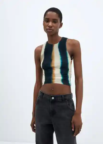 Cuello Redondo Detalle Fruncido Diseño Crop Diseño Entallado Estampado de Rayas Tie-Dye Forro Interior Sin Mangas Tejido de Malla Tirantes Anchos - 57059117_20.