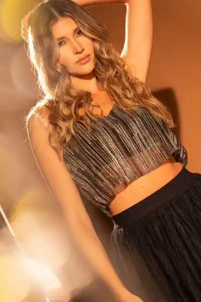 En Tejido de Punto Plisado Con Lurex Tiras Con Tensores Escote en V Forro Interno en Chalis Fondo Entero.