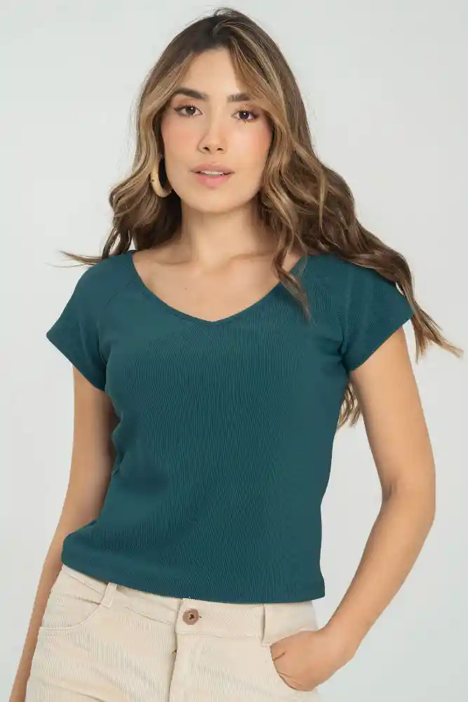 Top en rib, escote pico, manga corta, silueta semi ajustada.
