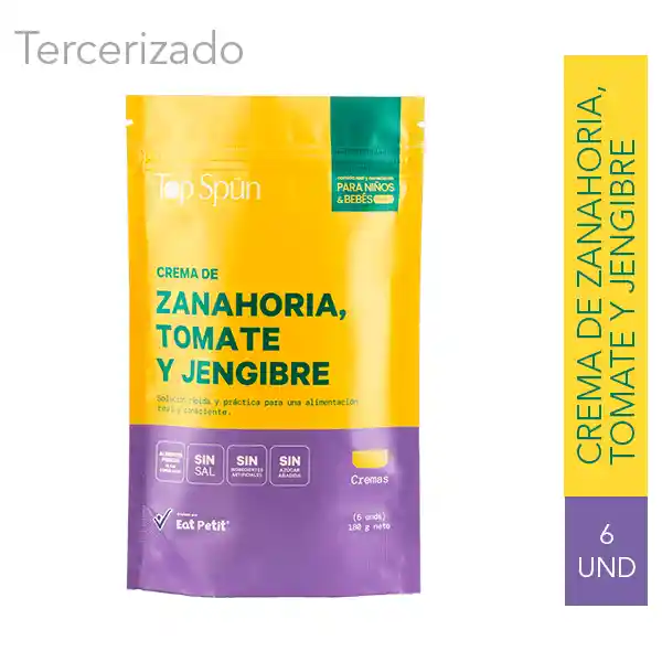 Contiene 6 Unidades. Producto Elaborado Por Top Spün. Alimentos Saludables y Con Formas Divertidas Brinda Una Alimentación 100% Natural a tu Bebé Está Recomendado Para Bebés de Los 7 Meses Hasta Los 3 Años de Edad. No Contiene Lácteos, Sal ni Azúcar Añadida. No Contiene Huevo. Crema de Zanahoria Tomate y Jengibre Listo Para Calentar y Consumir.