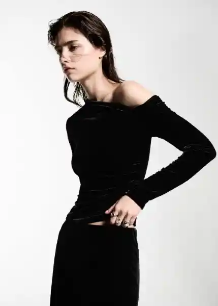 Cuello Asimétrico, Detalles Fruncidos, Diseño Asimétrico, Diseño Entallado, Manga Larga, Sin Cierre, Tejido de Terciopelo - 77049060_99.