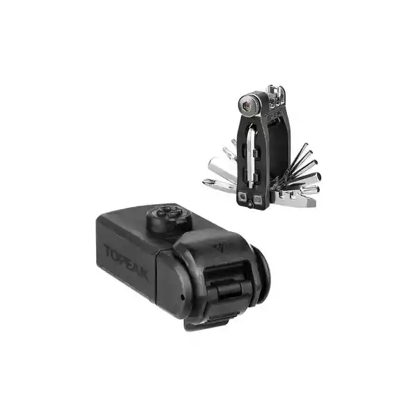Con un Simple Giro Para Acoplarse Con la Jaula de la Serie Ninja Master Esta Caja de Herramientas Resistente a la Intemperie Contiene Una Mini Herramienta de Metal de 16 Funciones Para Reparación y Mantenimiento Básicos. Llaves Allen: 2 / 25 / 3/4 (Tipo L) / 5/8 mm Punta Hexagonal de 6 mm Llaves Torx: T10 / T15 / T25 Destornilladores de Cabeza Plana / Estrella Llaves Para Radios: 14 g / 15 g Herramienta de Cadena de Acero Crmo y Gancho de Cadena.