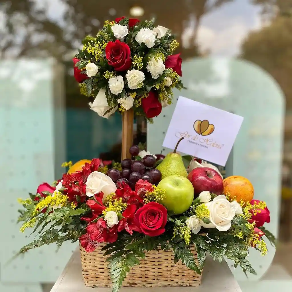 Hermoso diseño floral elaborado por Flor de Helena, hecho con rosas frescas, clavellines, solidago amarillo, astromelias, helecho cuero, Manzanas, Peras, Granadillas, Uvas, en un canasto rectangular tejido artesanal.