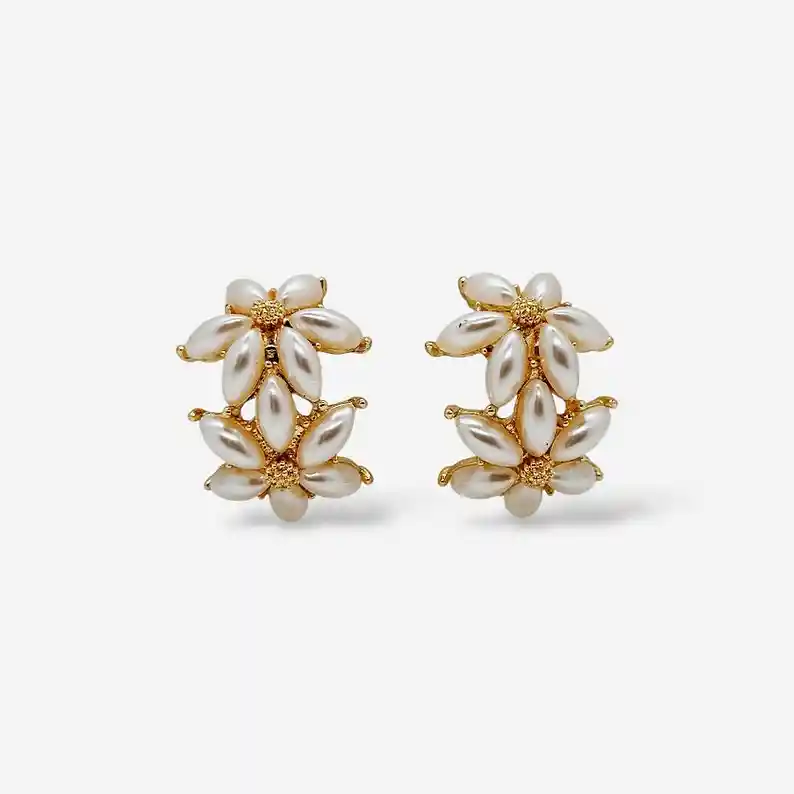 Topos Flor Perla, un diseño elegante y sofisticado que combina la delicadeza de las perlas con la estructura de una candonga. Están formados por dos flores unidas, cuyos pétalos están decorados con perlas artificiales, creando un efecto llamativo y refinado. Detalles: ◦ Material: Bronce con baño de rodio y oro de 18K. ◦ Material Petalos: Perla artiificial. ◦ Tamaño: 3.1 cm de largo y 2.1 cm de ancho ◦ Hipoalergénicos y resistentes: No se ponen negros con el tiempo.