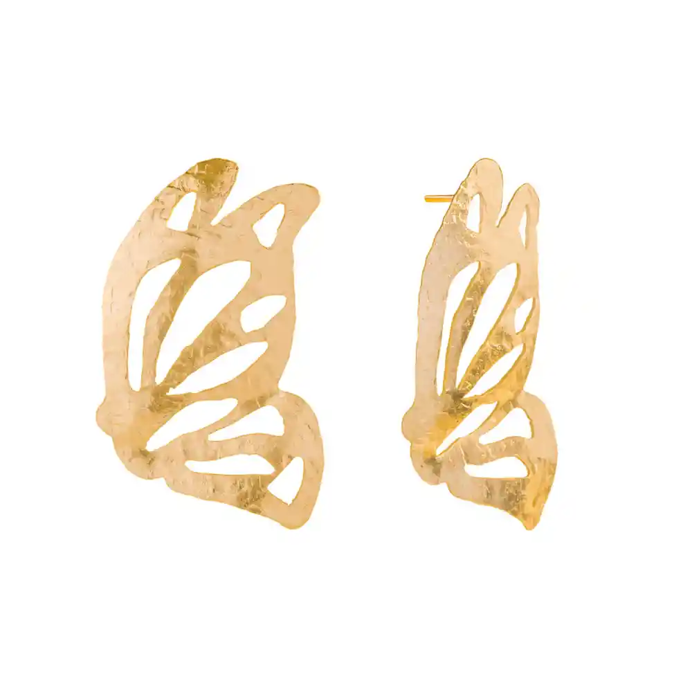 MARIA RESTREPO ENIGMA JOYERÍA Estas alas de mariposa enmarcan el rostro, eso sin mencionar que su acabado es único y que son súper ligeros. Perfectas para ocasiones elegantes en épocas de primavera y verano. ¡Para que brilles por tu cuenta! • Topos en bronce con baño oro 24k • Medidas: Largo 4,4 cm, Ancho 2,6 cm, Alto 1,2 cm • Peso en gramos: 2,2g CUIDADOS • Evita el contacto directo con cremas, perfumes, splash, lacas, tinturas, bronceadores, cloro y alcohol. • Guarde cada producto en su empaque individual para evitar rayones, enredos, cambio de forma o desgaste en acabados. • Evite el contacto con agua de mar y agua de piscina. • Evite caídas, golpes o manipulación fuerte del producto. GARANTÍA • Garantía en tiendas físicas y plataformas Online.