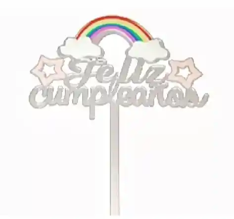 Topper acrílico. Figura Arco Iris Felíz Cumpleaños. Colores plateado y dorado. Ideal para decorar pasteles, cupcakes, postres y más. Medida de la figura 11 x 6.5 Cms.