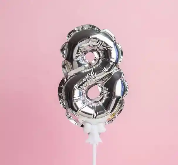 topper para torta de numero color plateado numero ocho en mini globo con base plástica incluida fácil de usar material dl globo metalizado IMPORTANTE PARA INFLARLO DEBES OPRIMIR LO QUE TRAER DENTRO EL GLOBO Y EL SOLITO SE COMIENZA A INFLAR, TENIENDO CUIDADO DE NO ROMPER EL GLOBO SI DESEAS ALGO ADICIONAL INDICANOS Y CON GUSTO TE COABORAMOS