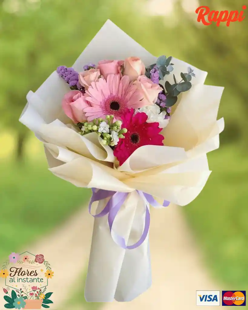 Un bouquet que combina elegancia y frescura. Envuelto en un sofisticado papel coreano, este arreglo destaca por la belleza de 6 rosas y 2 gerberas. Las hojas de lavanda y eucalipto le dan un toque aromático y natural, creando una composición hermosa y memorable.
