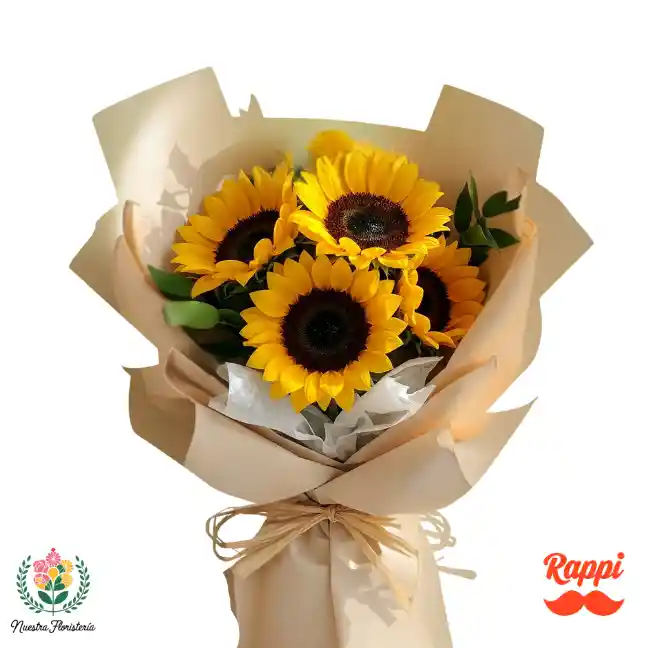 Este alegre ramillete captura la vitalidad del sol con sus brillantes girasoles medianos. Unas pocas hojas verdes complementan la calidez de las flores, mientras el envoltorio en elegante papel coreano y el lazo rústico o de rafia le dan un toque natural y moderno. Es el regalo perfecto para iluminar cualquier día.