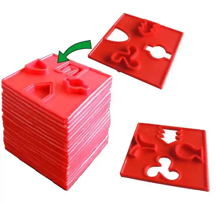 Fabricado en plástico flexible de 5 mm de espesor 24 fichas de 6 x 6 cm. Empaque: Caja plástica de 16 x 13 x 3 cm.