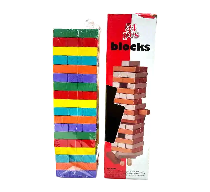 Torre desafío en madera de 26x8x8 cm con 54 piezas de colores. Ideal para jugar en grupo, mejorar la destreza y pasar momentos divertidos.
