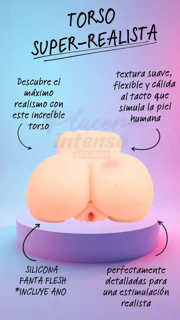 Descubre el máximo realismo con este increíble torso fabricado en material Fanta Flesh, una textura suave, flexible y cálida al tacto que simula la piel humana. Este modelo ofrece una experiencia íntima intensa con una doble cavidad: vagina y ano, perfectamente detalladas para una estimulación realista desde cualquier ángulo. Su diseño ergonómico permite un agarre cómodo y estable durante el uso, ideal para sesiones de placer prolongadas. Perfecto para quienes buscan una sensación auténtica y discreta, con materiales seguros para el cuerpo. CARACTERISTICAS: *SILICONA FANTAFLESH *LARGO 19CM *DIAMETRO 16CM *INCLUYE ANO *COLOR PIEL